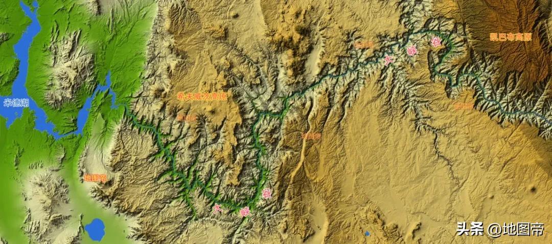 大峽谷總長446千米,平均深度有1200米,寬度從0.5千米至29千米不等。科羅拉多高原抬升時,科羅拉多河及其支流切割層層沉積岩,由此形成了大峽谷。