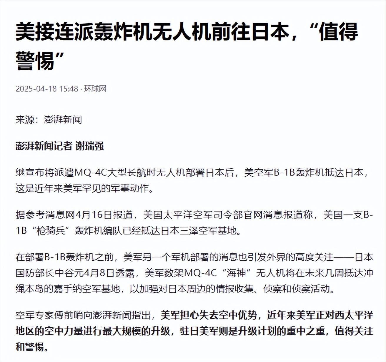 美空軍B-1B轟炸機抵達日本,執行戰略威懾任務,澎湃新聞,2025-04-17