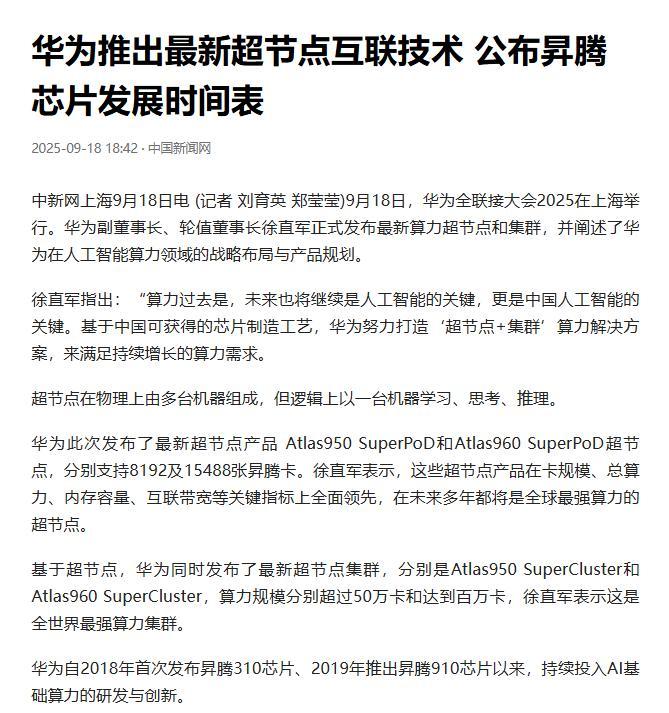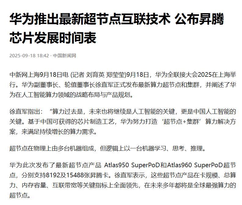 華爲推出最新超節點互聯技術 公佈昇騰芯片發展時間表,中國新聞網,2025-09-18
