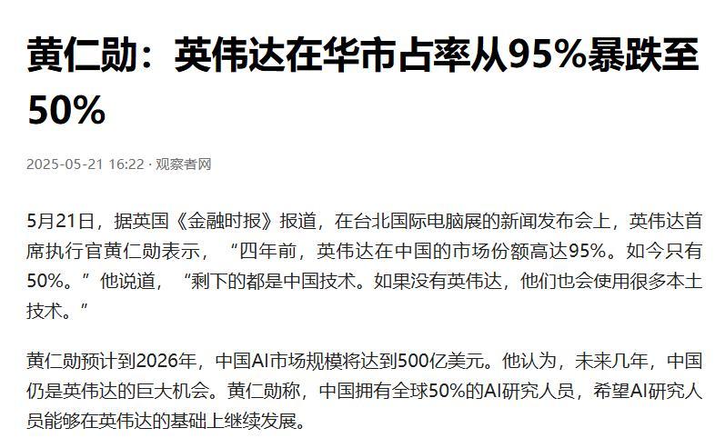 黃仁勳:英偉達在華市佔率從95%暴跌至50%,觀察者網,2025-05-21