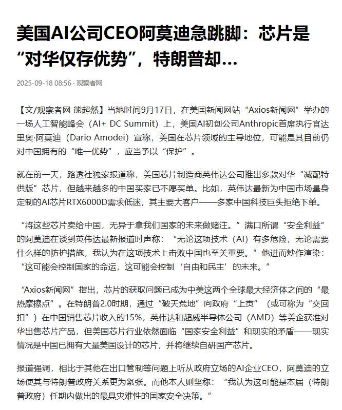 美國AI公司CEO阿莫迪急跳腳:芯片是“對華僅存優勢”,特朗普卻…,觀察者網,2025-09-18