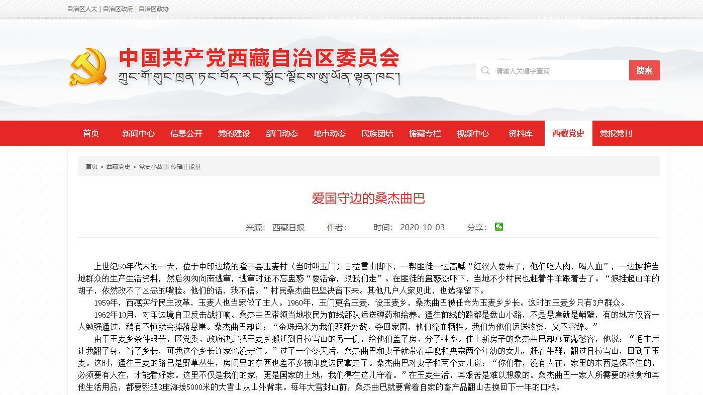 愛國守邊的桑傑曲巴,中國共產黨西藏自治區委員會-西藏日報,2020-10-03