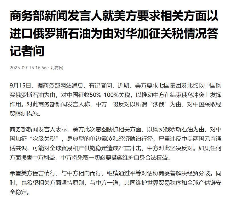 美方要求盟友以進口俄油爲由對華加稅,我商務部駁斥,觀察者網,2025-09-15