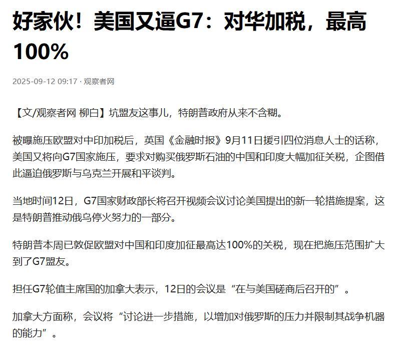 好傢伙!美國又逼G7:對華加稅,最高100%,觀察者網,2025-09-12