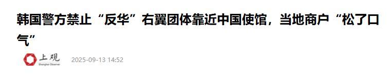 2.《韓國警方禁止“反華”右翼團體靠近中國使館,當地商戶“鬆了口氣”》2025-09-13 14:52 | 來源:上觀新聞