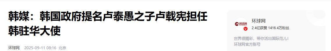 3.《韓媒:韓國政府提名盧泰愚之子盧載憲擔任韓駐華大使》2025-09-11 08:16 | 來源:環球網