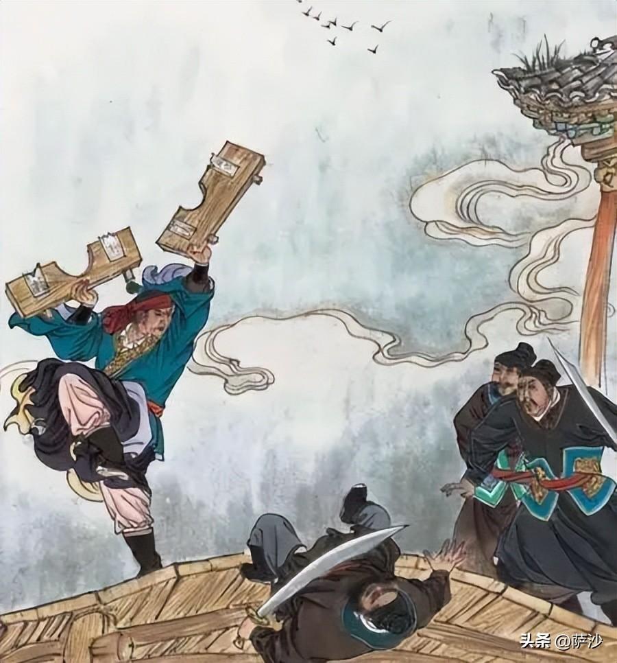 即便武松能夠破壞刑具,僅僅憑着兩塊包鐵的短木板對付四個敵人,也是非常兇險的。