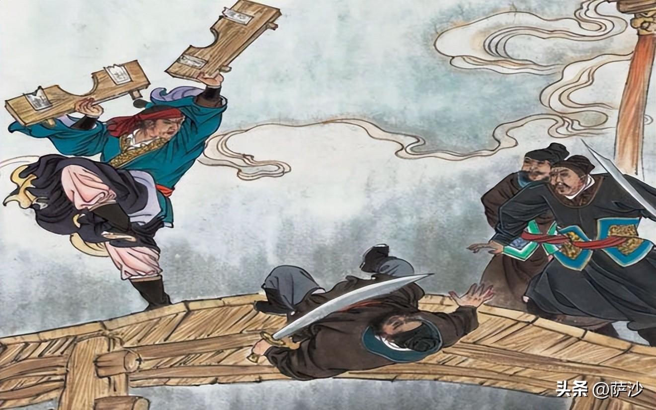 如果公差們的警惕性較高,躲過了武松的偷襲,隨後四人拿着兵器在橋上同武松拼命。