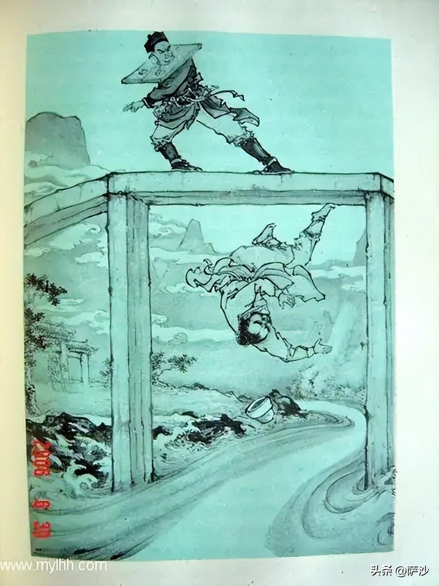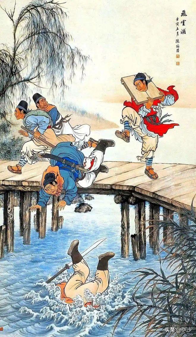 所以,武松裝作要小便,突然先下手爲強,一腳一個將兩個公人踢入河中,直接摔死。
