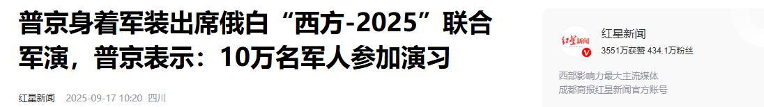 2.《普京身着軍裝出席俄白“西方-2025”聯合軍演,普京表示:10萬名軍人蔘加演習》2025-09-17 10:20 | 來源:紅星新聞