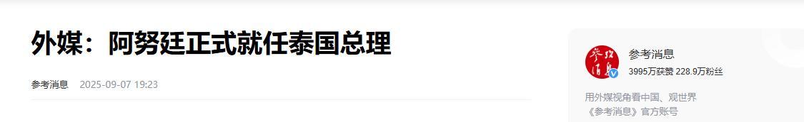1.《外媒:阿努廷正式就任泰國總理》2025-09-07 19:23 | 來源:參考消息
