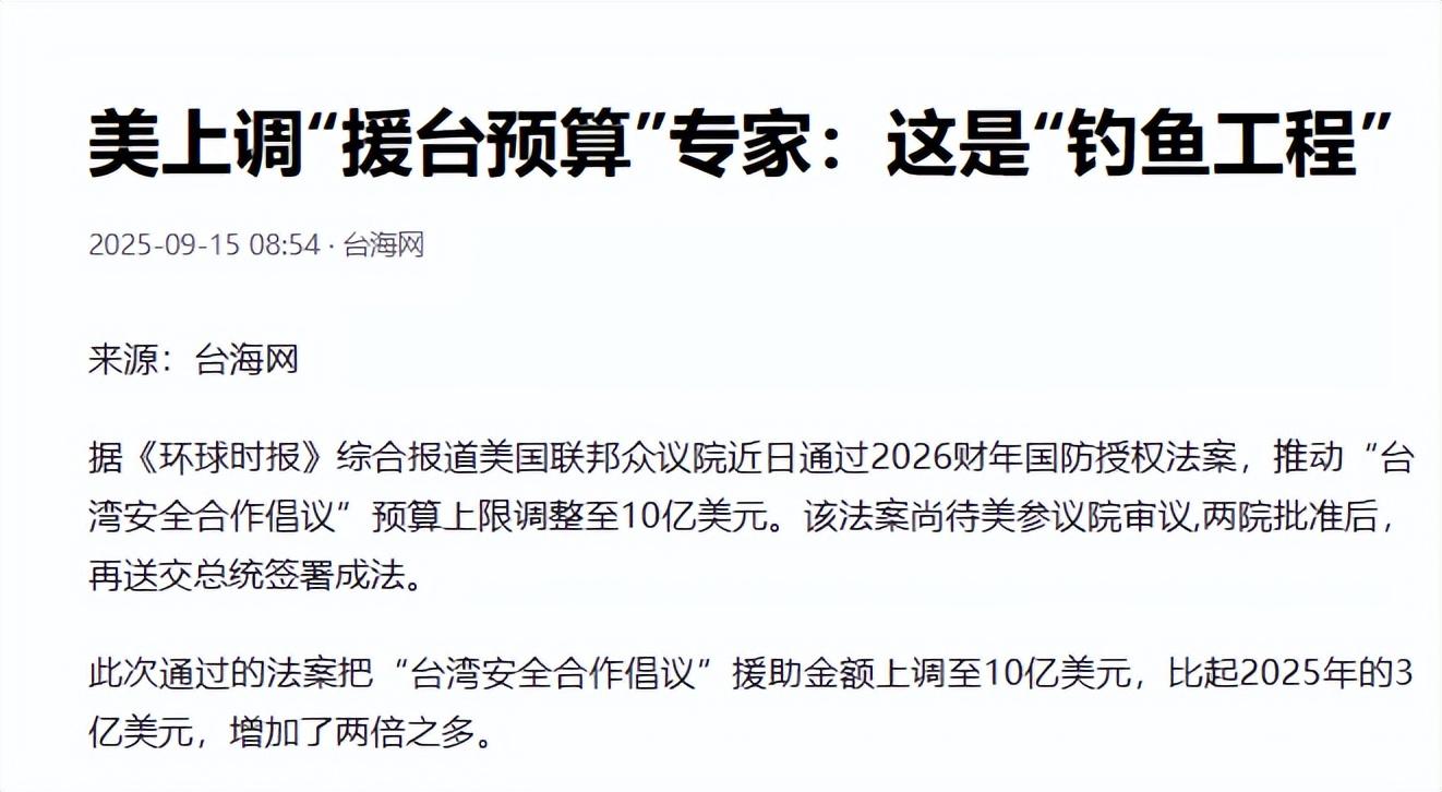 美衆院將“援臺預算”大增至10億美元 臺網友示警:買二送一,中國臺灣網,2025-09-13