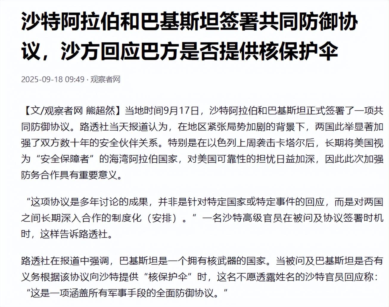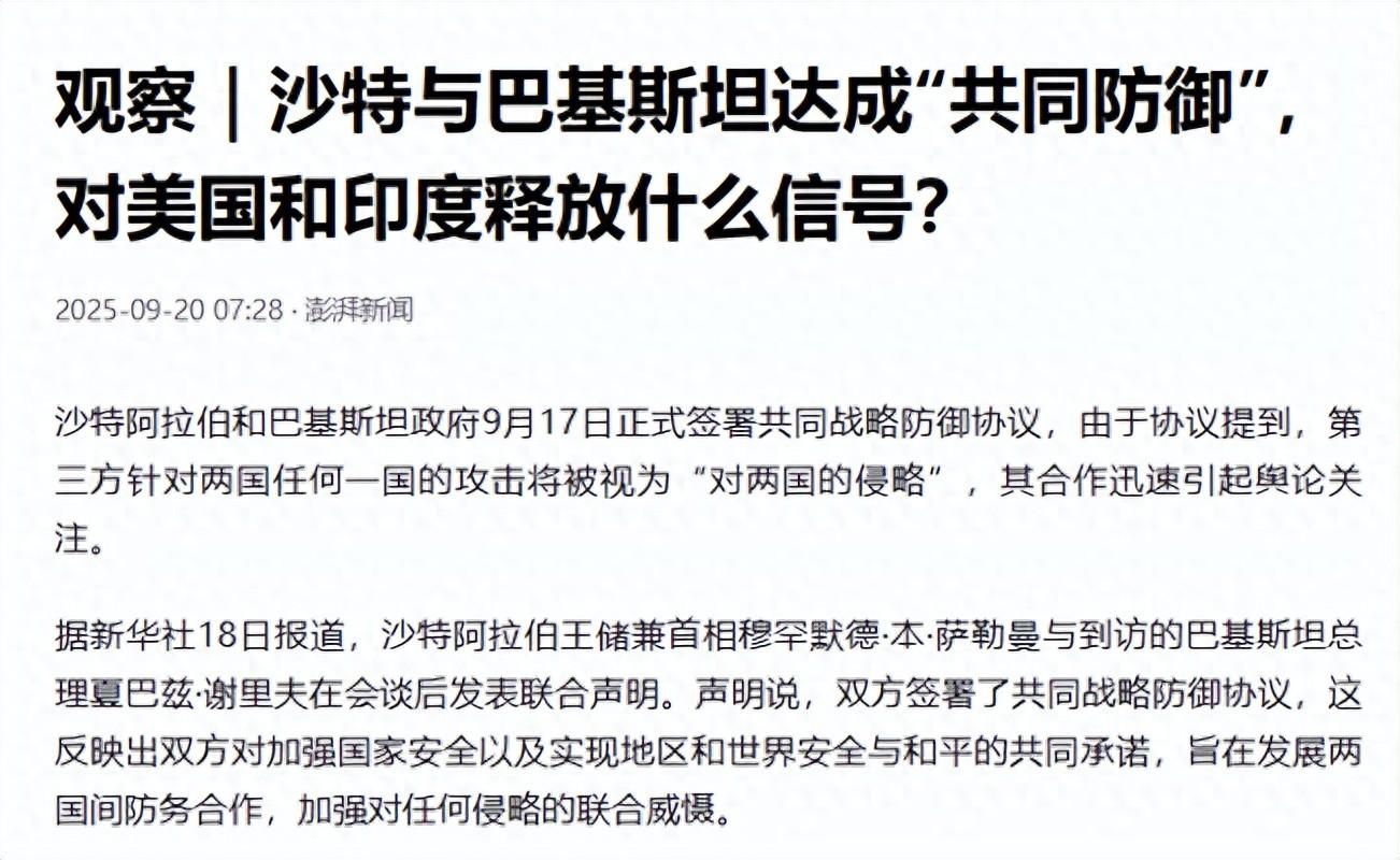 沙特和巴基斯坦簽署共同戰略防禦協議,中國新聞網,2025年09月18日