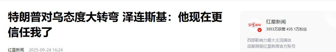 1.《特朗普對烏態度大轉彎 澤連斯基:他現在更信任我了》2025-09-24 16:24 | 來源:紅星新聞
