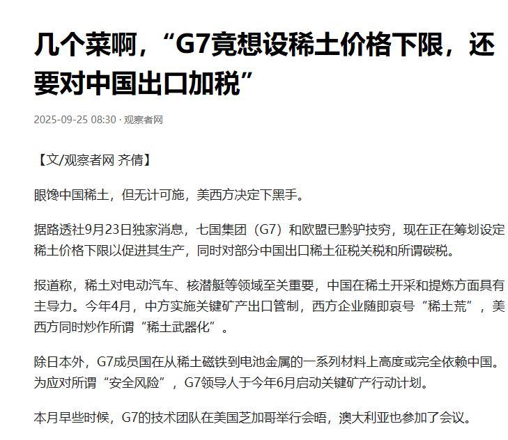 幾個菜啊,“G7竟想設稀土價格下限,還要對中國出口加稅”,觀察者網,2025-09-25