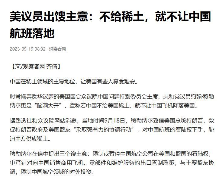 美議員出餿主意:不給稀土,就不讓中國航班落地,觀察者網,2025-09-19