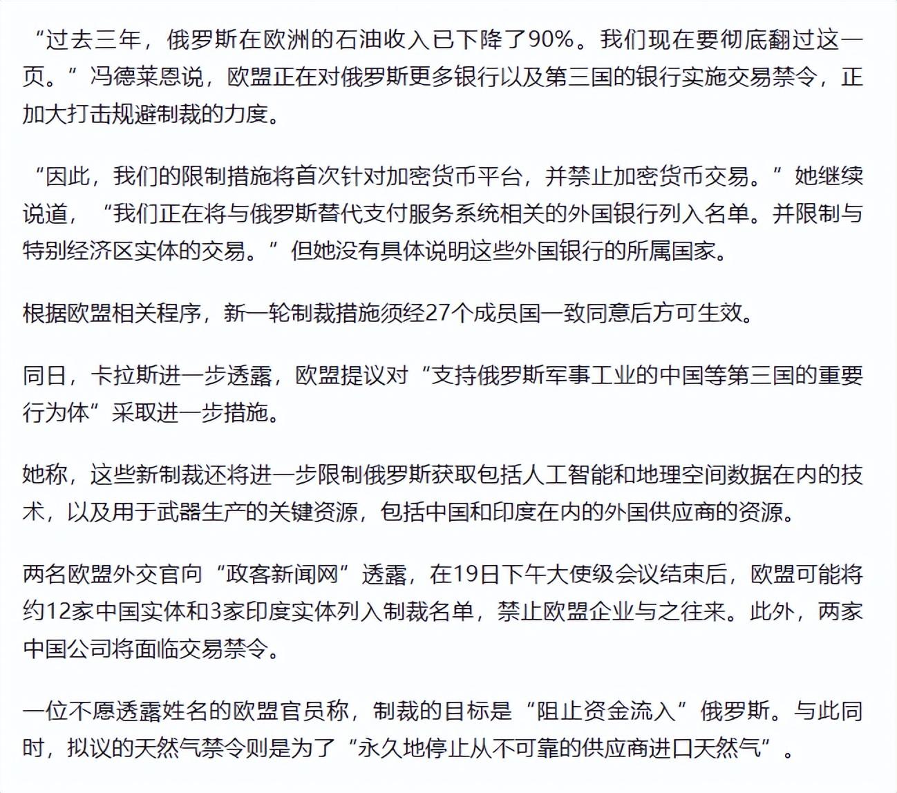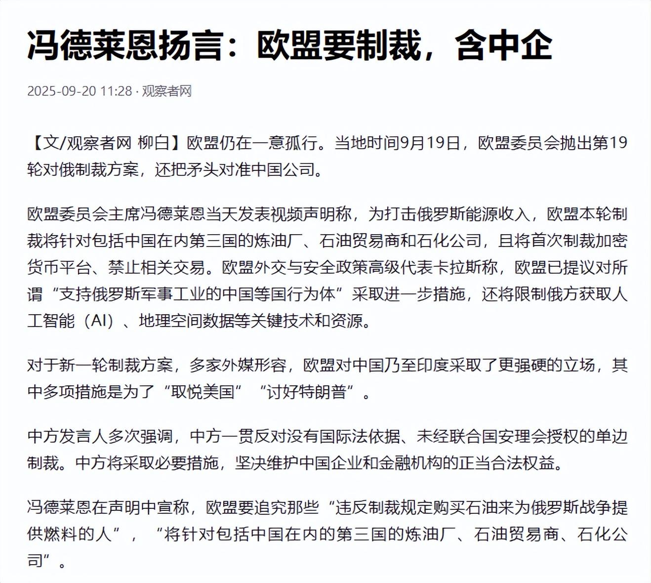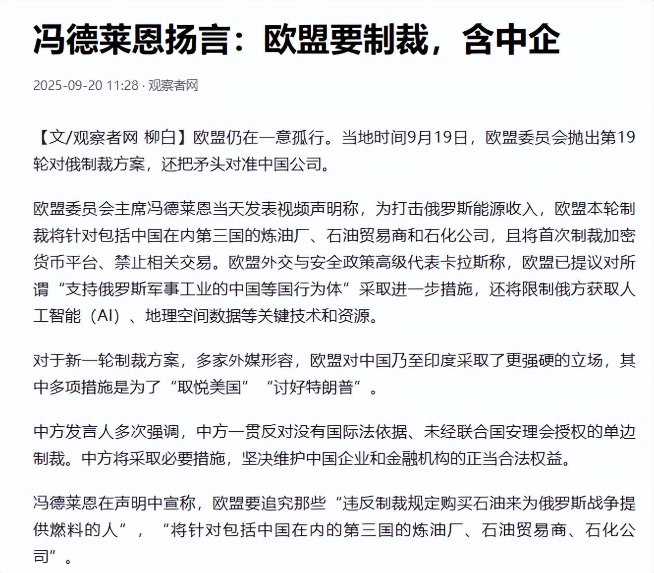 馮德萊恩揚言:歐盟要制裁,含中企,觀察者網,2025-09-20