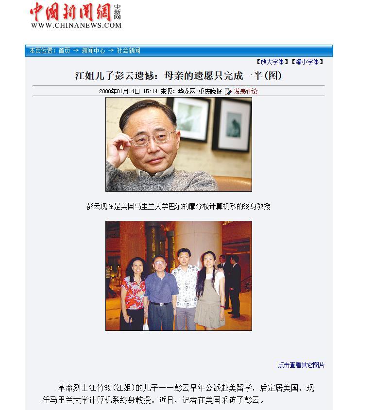 江姐兒子彭雲遺憾:母親的遺願只完成一半(圖),中國新聞網-華龍網-重慶晚報,2008年01月14日
