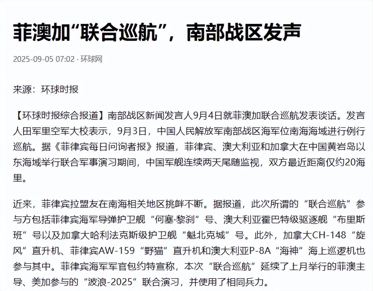 菲澳加“聯合巡航”,南部戰區發聲,環球時報,2025年09月05日