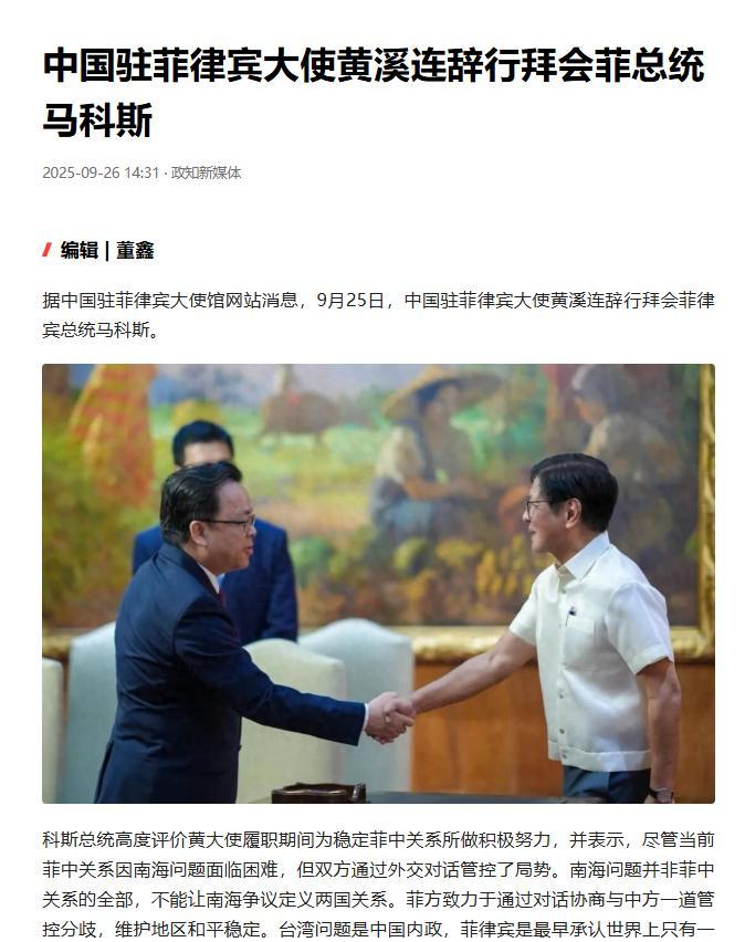 中國駐菲律賓大使黃溪連辭行拜會菲總統馬科斯,中國新聞網,2025年09月25日