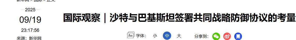 《國際觀察|沙特與巴基斯坦簽署共同戰略防禦協議的考量》2025年09月19日 來源:新華網
