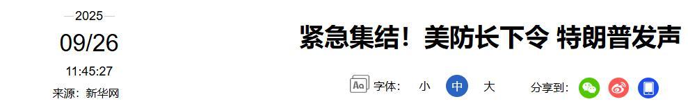 《緊急集結!美防長下令 特朗普發聲》2025年09月26日 來源:新華網