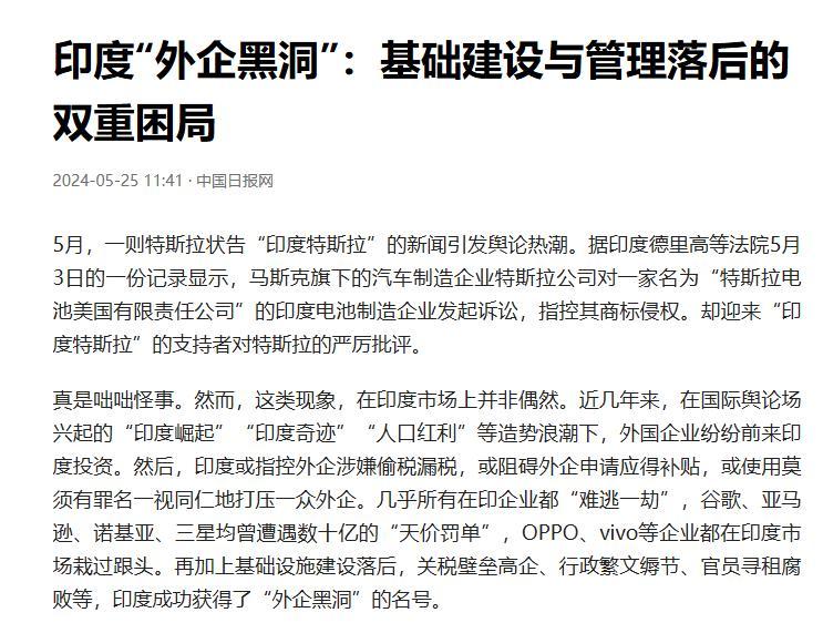 印度“外企黑洞”:基礎建設與管理落後的雙重困局,中國日報網,2024-05-25日