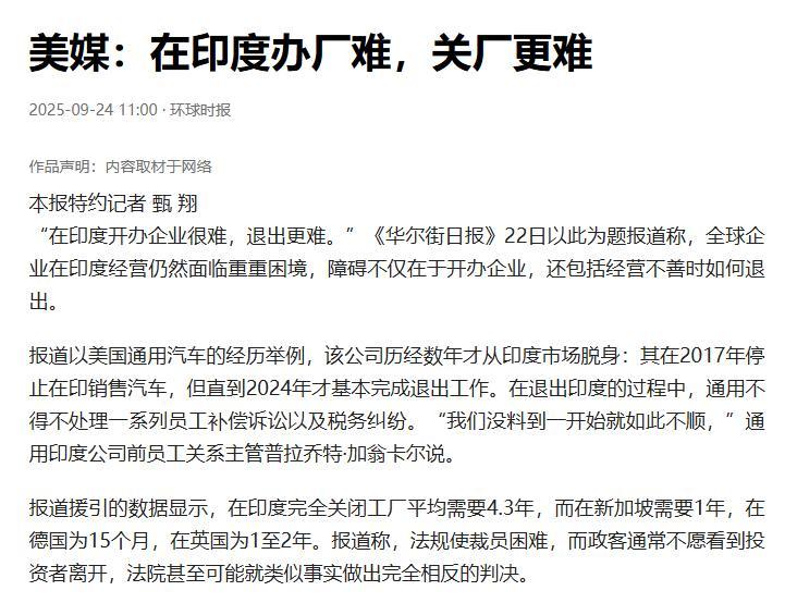 美媒:在印度辦廠難,關廠更難,環球時報,2025-09-24