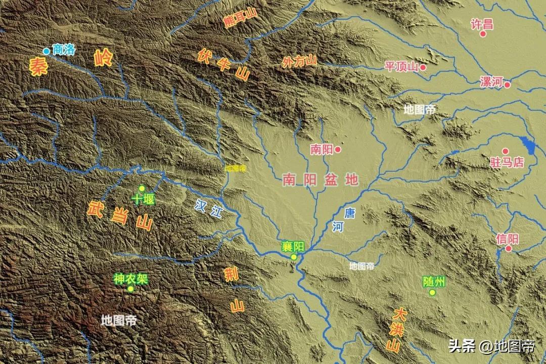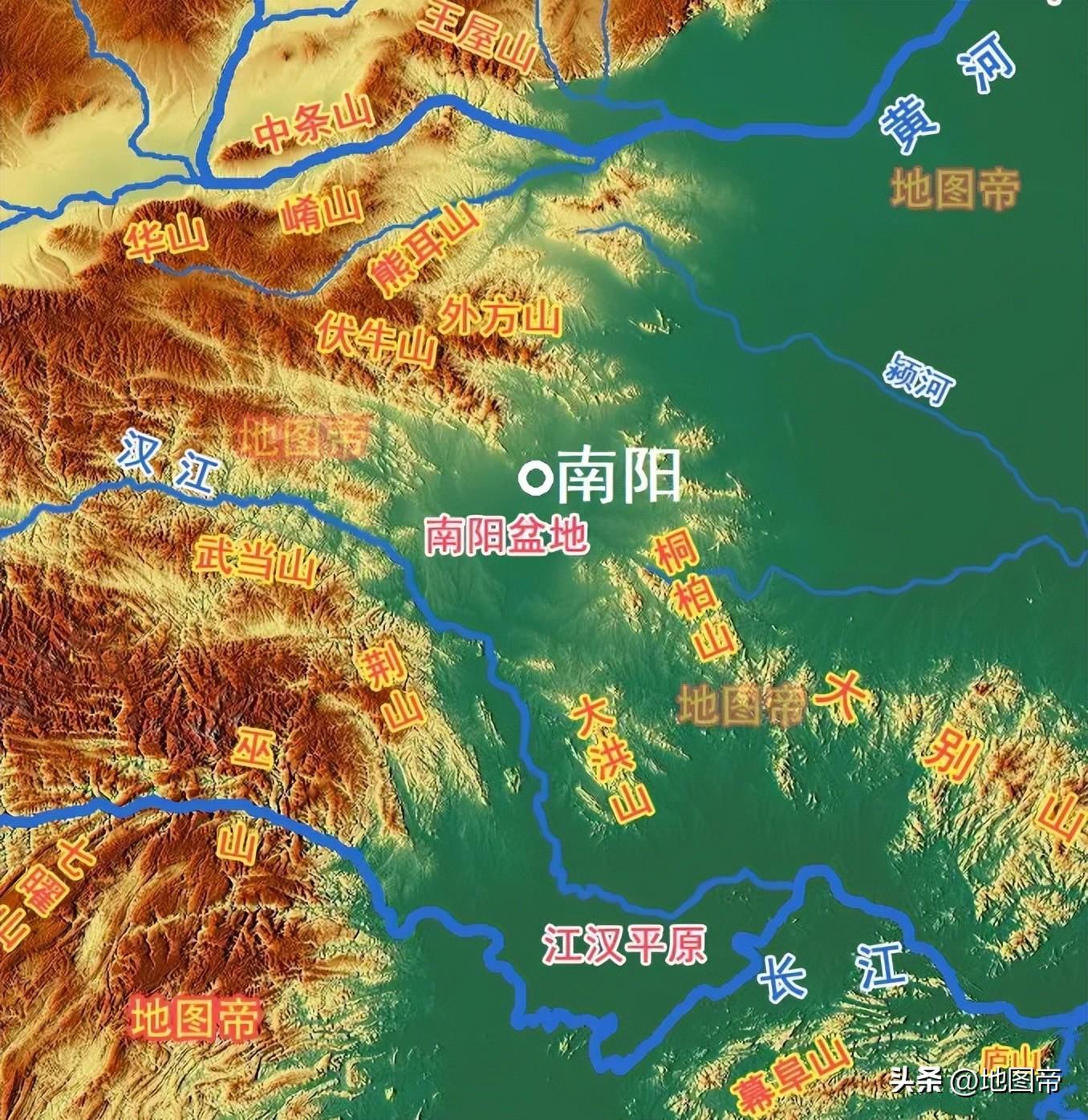 南陽盆地三面環山,南部開口,大致是秦嶺西部的伏牛山、外方山、方城山、桐柏山、大洪山、荊山、武當山圍成的區域,由漢水支流丹江、唐河、白河等河流沖積形成。