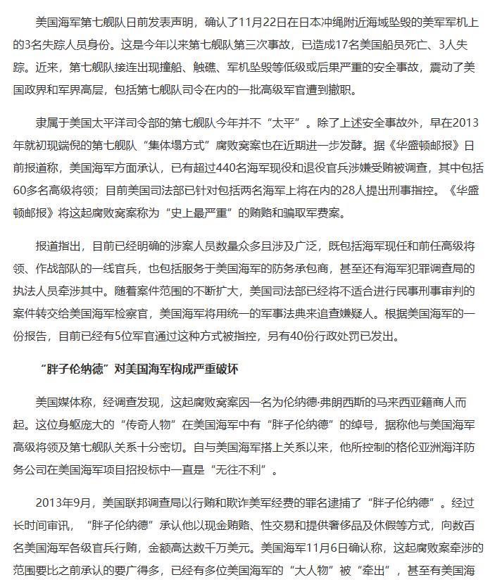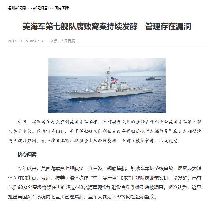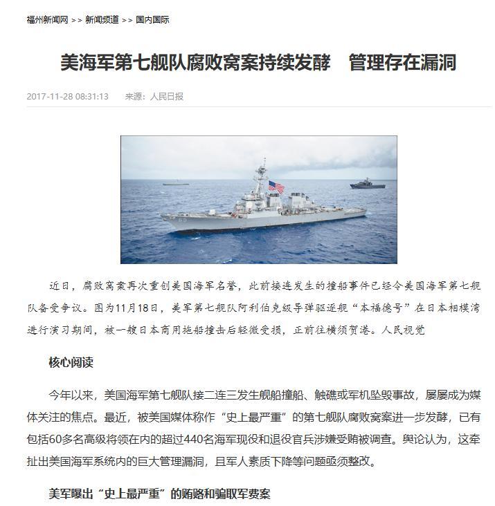美海軍第七艦隊腐敗窩案持續發酵 管理存在漏洞 人民日報 2017-11-28