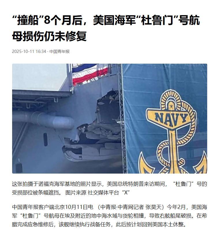 “撞船”8個月後,美國海軍“杜魯門”號航母損傷仍未修復 中國青年報 2025-10-11