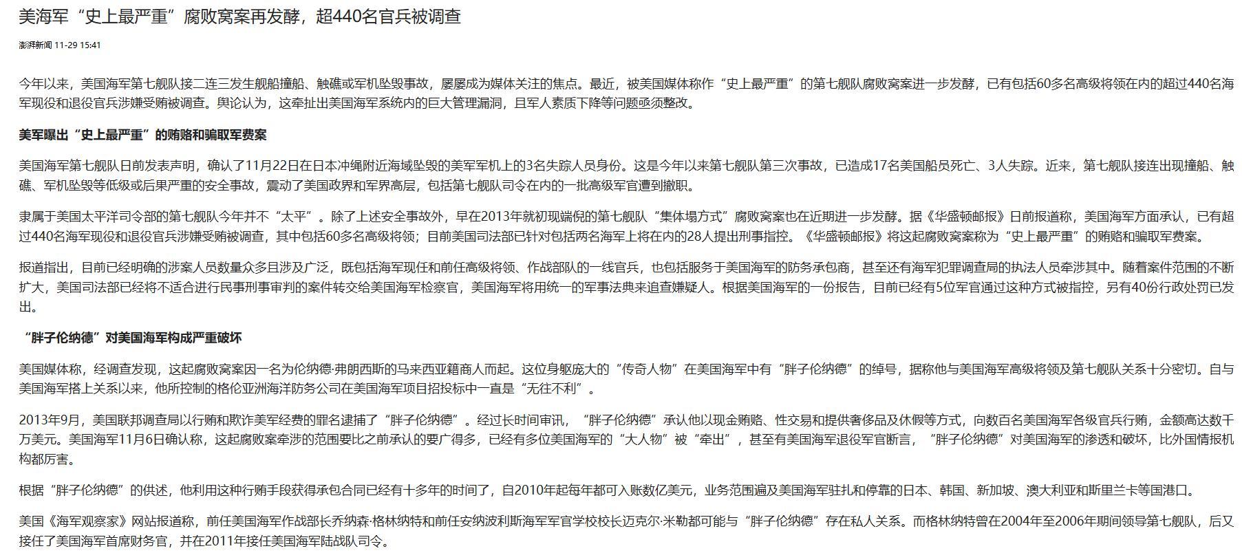 美國海軍第七艦隊腐敗窩案持續發酵,央廣網,2017-11-28
