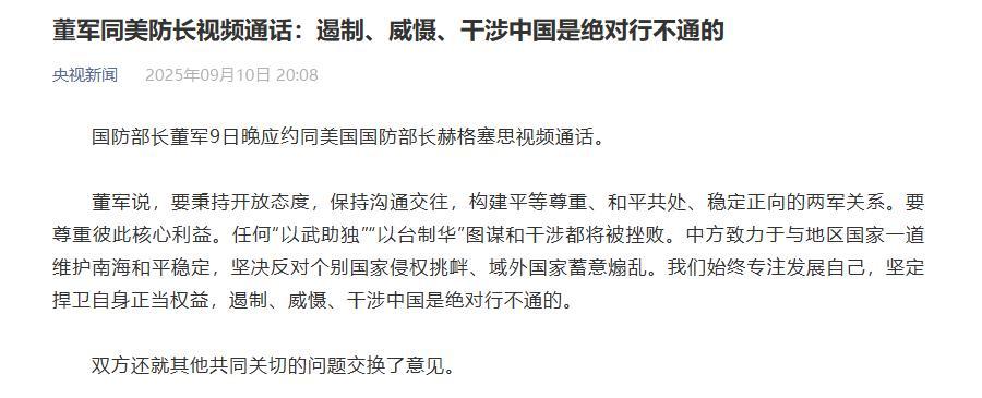 到了2025年,這戲演得更嫺熟了。9月9日,中美防長終於通了電話,之前美國打了三次都沒人接,這次總算接了。