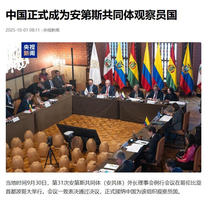安第斯共同體外長理事會例行會議現場,一項歷史性決議全票通過——中國正式“加羣”,成爲安共體觀察員國。