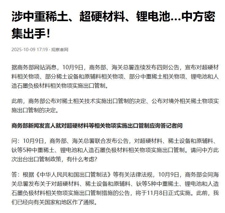 2025年10月9日,我方發佈新規,對超硬材料、稀土設備、鈥等5種中重稀土、鋰電池、人造石墨負極材料實施出口管制。