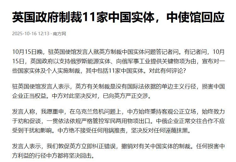 英國政府制裁11家中國實體,中使館回應,南方網,2025-10-16