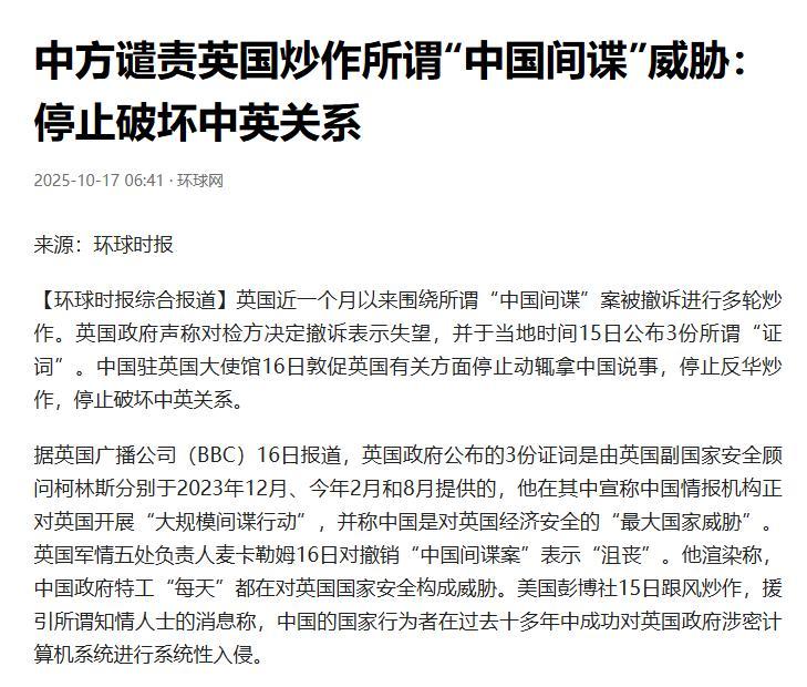 中方譴責英國炒作所謂“中國間諜”威脅:停止破壞中英關係,環球網,2025-10-17