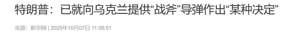 《特朗普:已就向烏克蘭提供“戰斧”導彈作出“某種決定”》2025年10月07日 來源:新華網