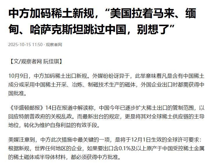 中方加碼稀土新規,“美國拉着馬來、緬甸、哈薩克斯坦跳過中國,別想了”,觀察者網,2025-10-15