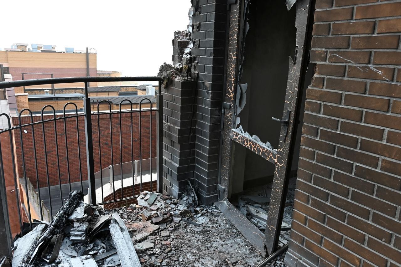 圖|2025年10月22日,烏克蘭基輔市,一公寓樓遭俄軍無人機襲擊損毀嚴重,建築殘骸引發公寓起火