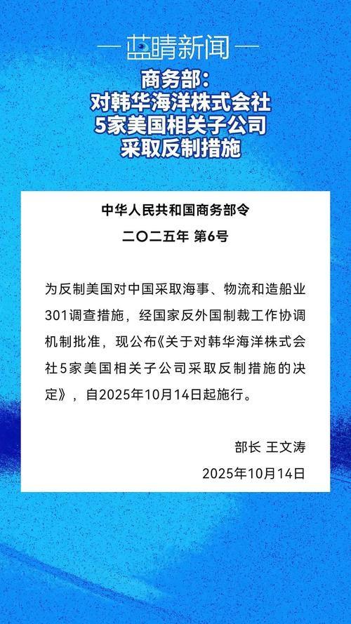 2025年10月14日,中方亮劍,韓華海洋旗下5家美國子公司被正式列入反制清單。制裁範圍明確,依據清晰,適用《反外國制裁法》,連豁免條款都沒給一個,直接掐斷對美業務對接鏈條。