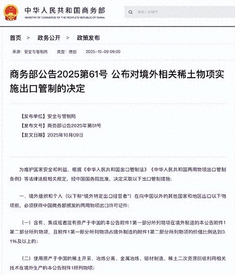 2025年10月9日,中國商務部和安全與管制局聯手發了張紙,名叫第61號公告,對部分稀土元素實施出口管制。