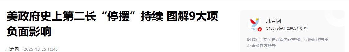 2.《美政府史上第二長“停擺”持續 圖解9大項負面影響》2025-10-25 10:45 | 來源:北青網