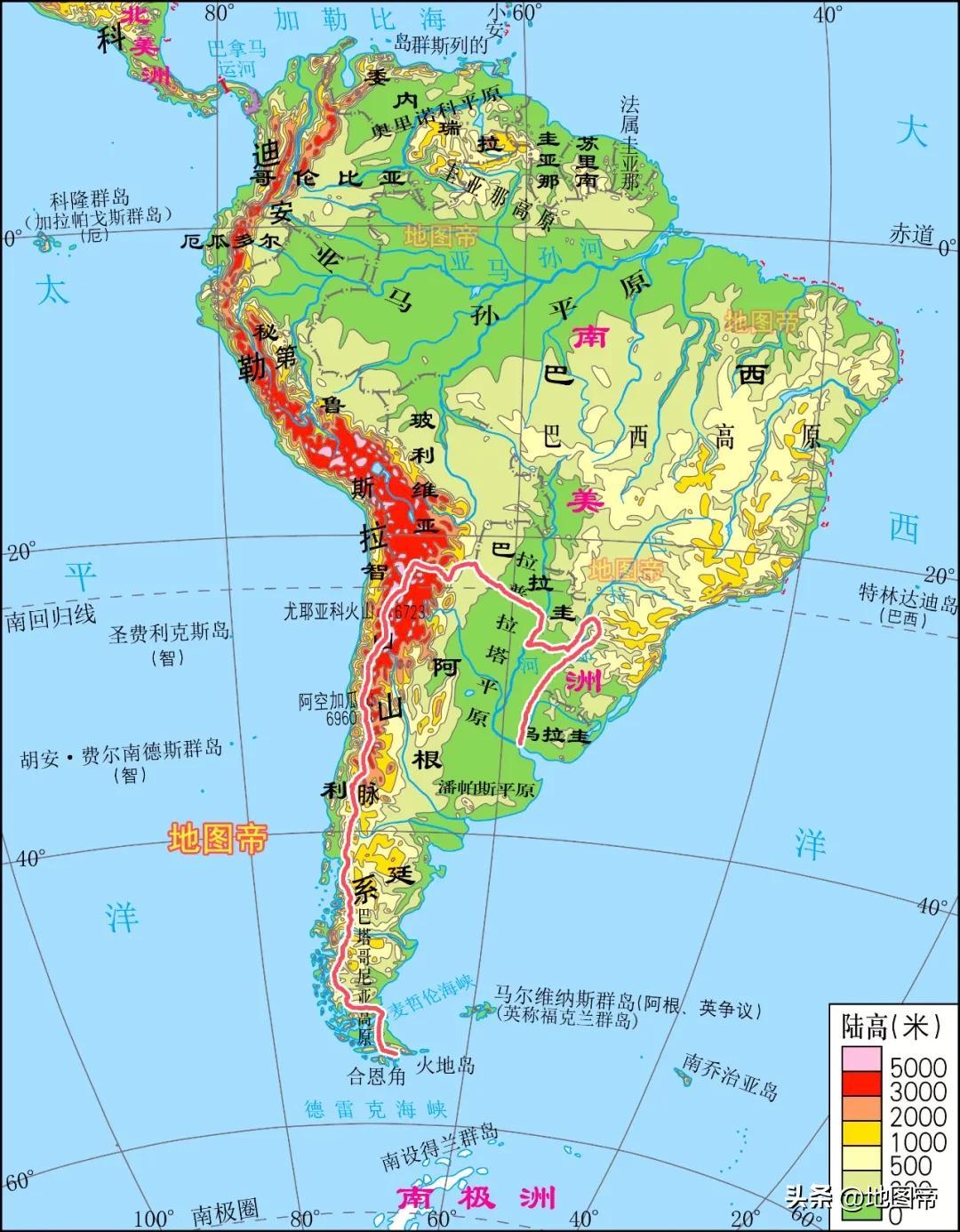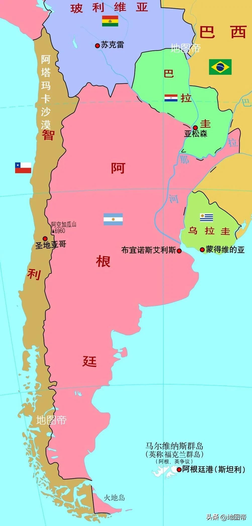 第六個是阿根廷,阿根廷與智利隔着安第斯山脈,正好也是南北走向的國家。阿根廷面積比智利大,南北長約3694千米,比智利的4352千米短658千米,註定是裝不下智利的。