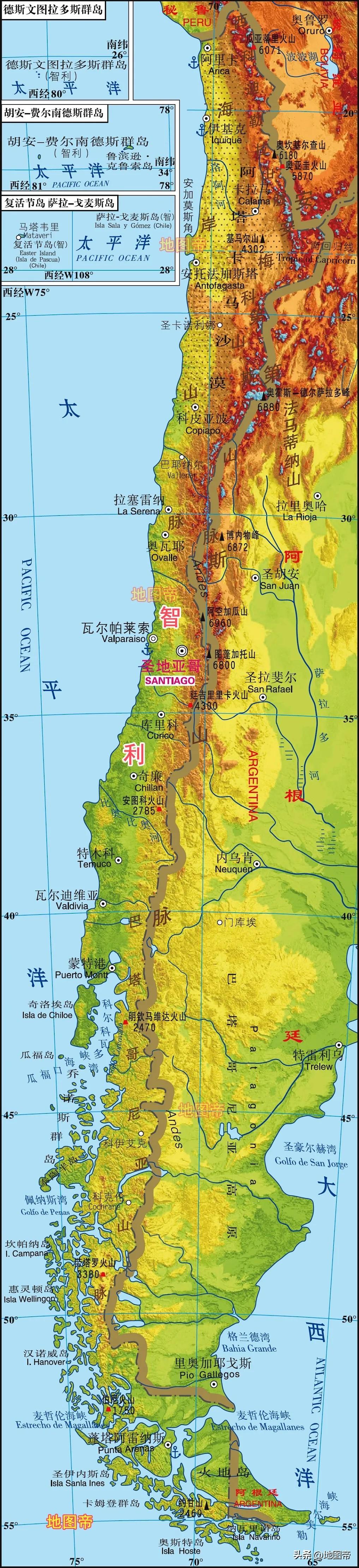這是什麼概念呢?我國臺灣島也是南北狹長,南北長約395千米,東西寬約144千米。智利長度是我國臺灣島的11倍,平均寬度與臺灣島最寬處相當,你想想把臺灣島拉長11倍的效果。
