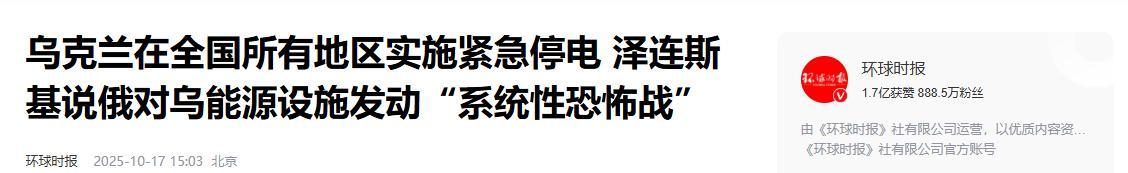 3.《烏克蘭在全國所有地區實施緊急停電 澤連斯基說俄對烏能源設施發動“系統性恐怖戰”》2025-10-17 15:03 | 來源:環球時報