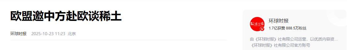 1.《歐盟邀中方赴歐談稀土》2025-10-23 11:23 | 來源:環球時報