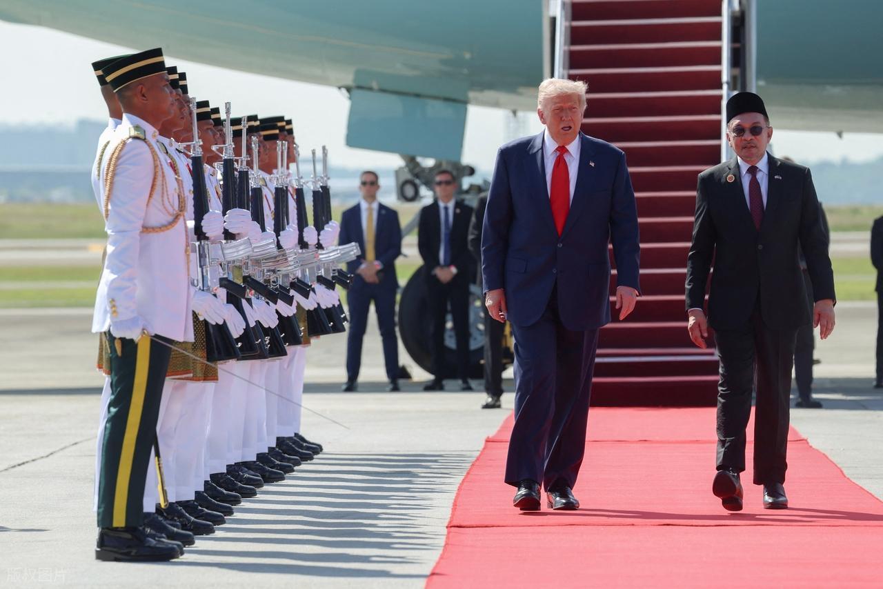 圖|2025年10月26日,馬來西亞雪邦,美國總統特朗普抵達吉隆坡國際機場,馬來西亞總理安瓦爾·易卜拉欣迎接