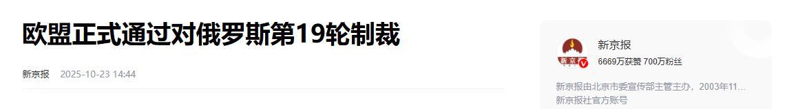 3.《歐盟正式通過對俄羅斯第19輪制裁》2025-10-23 14:44 | 來源:新京報