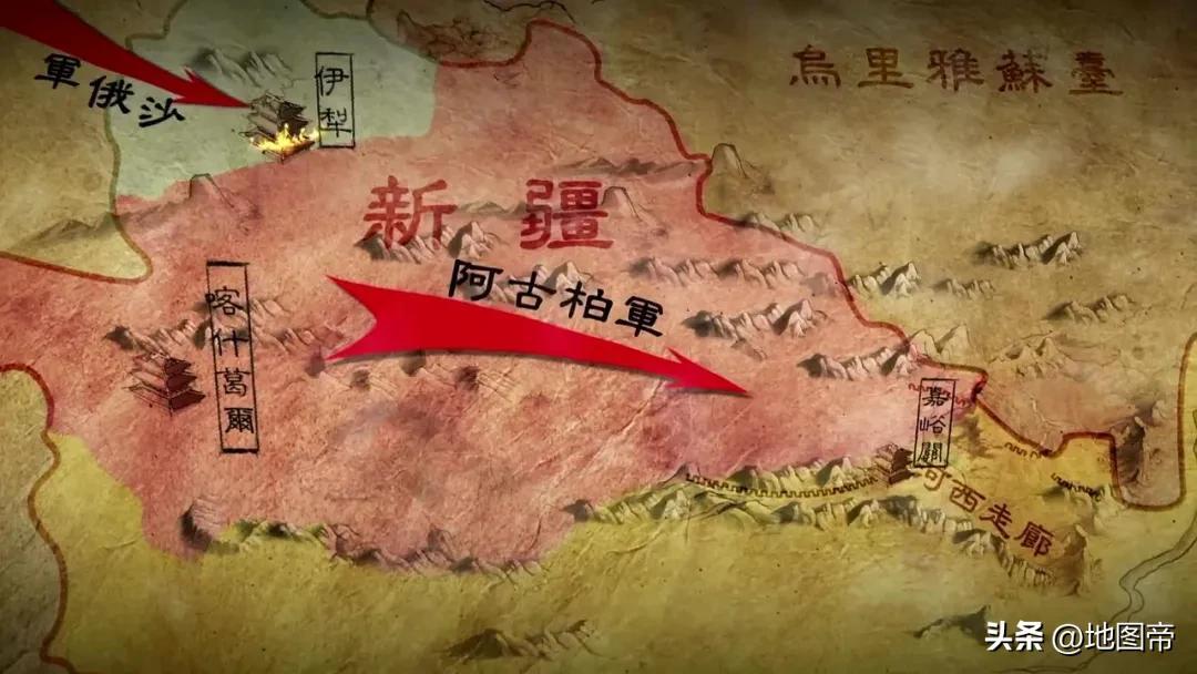 1871年(清穆宗同治十年),沙俄出兵攻佔伊犁,清朝除塔城、烏蘇等少數據點外,新疆領土損失殆盡。沙俄、英國將阿古柏視作鷹犬,爲其輸送軍火;阿古柏也利用沙俄和英國幫其立足。總之各方狼狽爲奸,謀圖清朝土地。